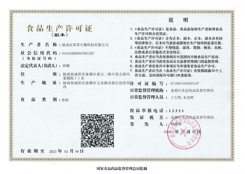 本公司現已與多所科研院緊密合作,公司擁有配套完整的提取、分離、萃取、柱層析、濃縮干燥等設備和技術,具有豐富的生產天然植物提取物的經驗和嚴格的質量控制體系。陜西百草萃生物科技有限公司為廣大消費著和客戶提供安全、健康、品質高、能效強的營養健康品,主營產品包括:國食健字鋅硒寶、鋅硒寶、欣寶兒童鋅硒寶、復合鋅硒片、復合蛋白鋅、千凈顆粒、蛋白乳鐵片、瑪咖復合片等、廠家占地五十余畝,廠家建筑面積4000余m2,內設生產車間、質量控制室、產品檢測中心、陰涼倉庫、..